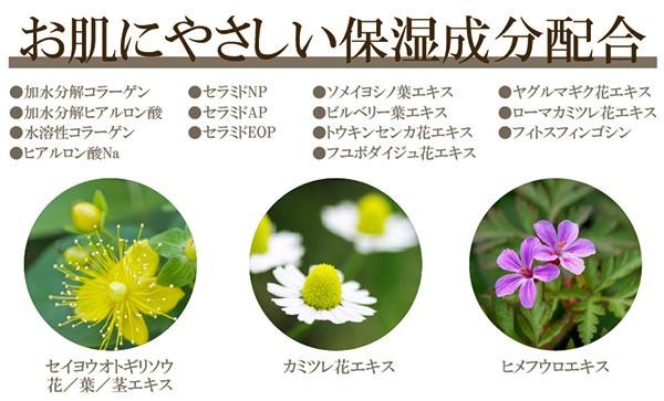 | 成分 | 水、BG、エタノール、ジヒドロキシアセトン、グリセリン、加水分解コラーゲン、加水分解ヒアルロン酸、水溶性コラーゲン、ヒアルロン酸Na、セラミドNP、セラミドAP、セラミドEOP、ソメイヨシノ葉エキス、ヒメフウロエキス、ビルベリー葉エキス、カミツレ花エキス、セイヨウオトギリソウ花/葉/茎エキス、トウキンセンカ花エキス、フユボダイジュ花エキス、ヤグルマギク花エキス、ローマカミツレ花エキス、フィトスフィンゴシン、グリチルリチン酸2K、パルミチン酸アスコルビルリン酸3Na、ラウロイルラクチレートNa、クエン酸、クエン酸Na、キサンタンガム、PEG-60水添ヒマシ油、カラメル、コレステロール、カルボマー、フェノキシエタノール、メチルパラベン |