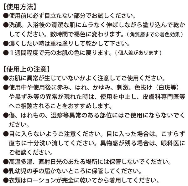 塗るだけ簡単、ムラなく小麦肌になれるタンニングローションです(角質層までの着色効果)。ロールオンタイプなので、手を汚さずムラなく塗りやすい♪紫外線による日焼けではないので、肌が赤くなってヒリヒリすることがありません。1週間程度で元のお肌の色に戻ります(個人差があります)。 |