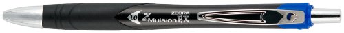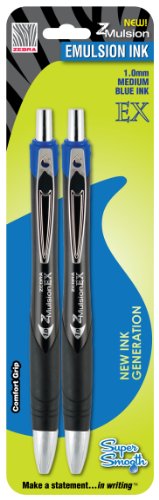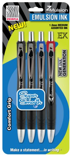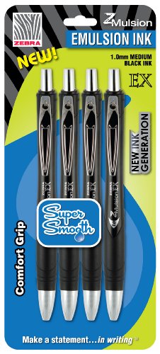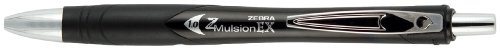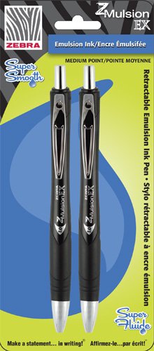 Retractable emulsion pens combine oil, water and pigment to deliver the smoothest writing experience. An effortless glide ensures a remarkable writing performance with every stroke of the pen. Ink is quick-drying and smear-resistant while maintaining brilliant and bold writing. Engraved emulsion emblem on the barrel and the metal accents of the plunger and tip offer a sleek appearance. Stylish, sophisticated, Z-Mulsion EX pens with fashion-forward accents also offer a comfort grip and the popular 1.0mm point size for a bold, streak-free write-out. The color of the rim around the plunger indicates ink color. Pens are refillable with Zebra EQ-Refills.