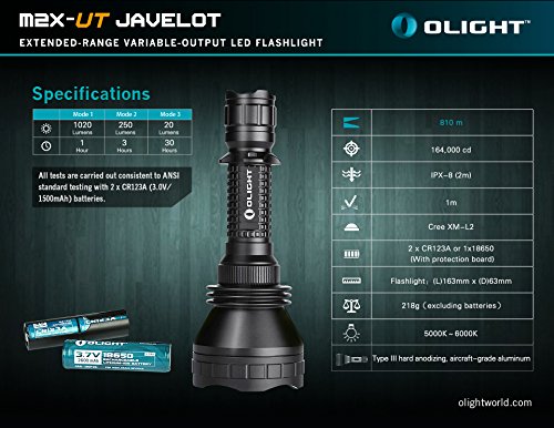 -. Brand : Olight -. EAN : 0815698012361 -. Feature : Customized CREE XM-L2 LED Max 1020 Lumens with a smooth reflector creates a tightly-focused beam to / Larger smooth reflector providing perfect beam with exceptional throw to reach out over 2600 feet/81 / Forward Tactical Tail Cap for easy on/off and momentary function / Easy user interface, change modes by rotating the head or tap the tail cap / Bundle includes two LegionArms CR123A lithium Batteries -. Label : Olight -. Manufacturer : Olight -. MPN : Olight M2X-UT -. PackageQuantity : 1 -. PartNumber : Olight M2X-UT -. ProductGroup : Sports -. ProductTypeName : OUTDOOR_RECREATION_PRODUCT -. Publisher : Olight -. Studio : Olight -. Title : Olight M2X-UT Javelot 1020 Lumens CREE XM-L2 LED Flashlight 810m Long Throw Distance Search Light with Two 3400mAh 18650 Batteries and Charger Kit -. UPC : 815698012361