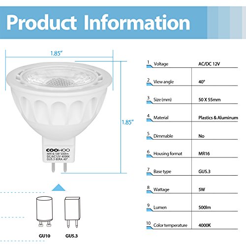 Studio : COOWOO Publisher : COOWOO Product Description About MR16 bulbs: MR16 lamps were originally designed for use in slide projectors, but see use in residential lighting and retail lighting as well. They are suited to applications that require directional lighting such as track lighting, recessed ceiling lights, desk lamps, pendant fixtures, landscape lighting, retail display lighting, and bicycle headlights. And the base of this MR housing is GU5.3. So what's new? ★Each bulb comes with an individual box for better storage. ★Every base is a standard fit, so switching over is hassle-free. ★All bulbs are fully FCC and CE compliant. ★Prices are lower than ever to give you unbeatable value. Specification: Brand: COOWOO Housing format: MR16 Base type: GU5.3 Wattage: 5W Lumen: 500lm Color temperature: 4000K Voltage: AC/DC 12V Beam angle: 40° Size (mm): 50 x 55mm Material: Plastics Aluminum Dimmable: No Package includes: GU5.3 LED Light Bulbs X 6 Individual packaging with outer gift box Why from COOWOO Every sales representative of COOWOO have been doing engineering before selling, and this tradition started from my great grandfather. We spend decades focusing on the improvement of lighting technology, taking up the torch of Edison to safeguard human being with lights! We offer 1 year warranty with 30 days worry-free return, so ZERO risk purchasing! 0