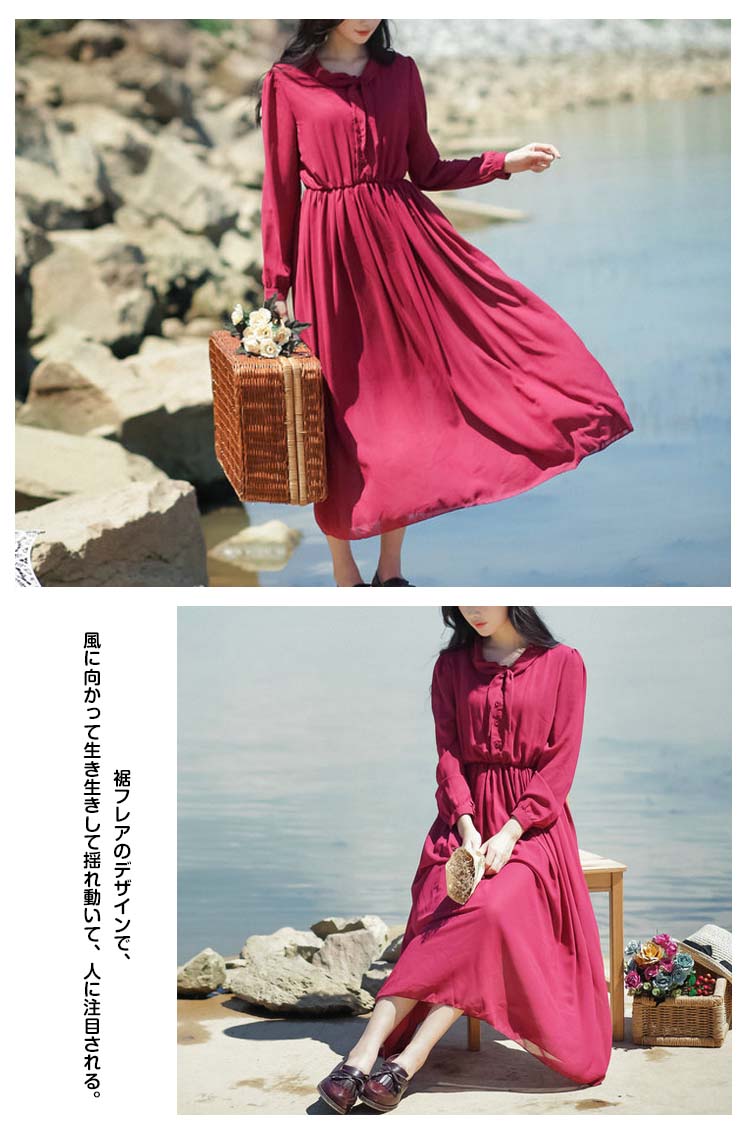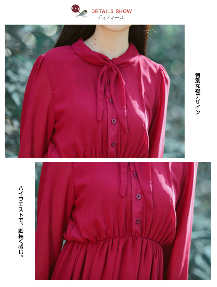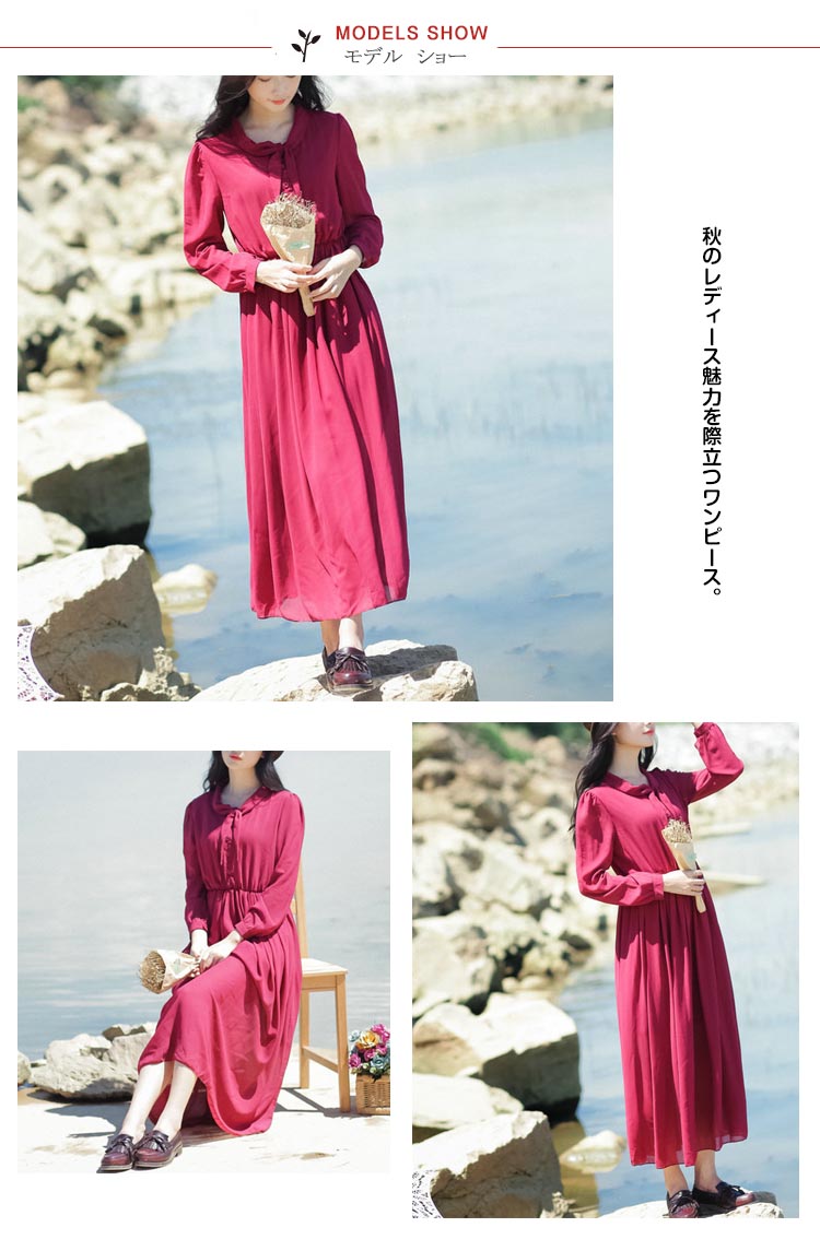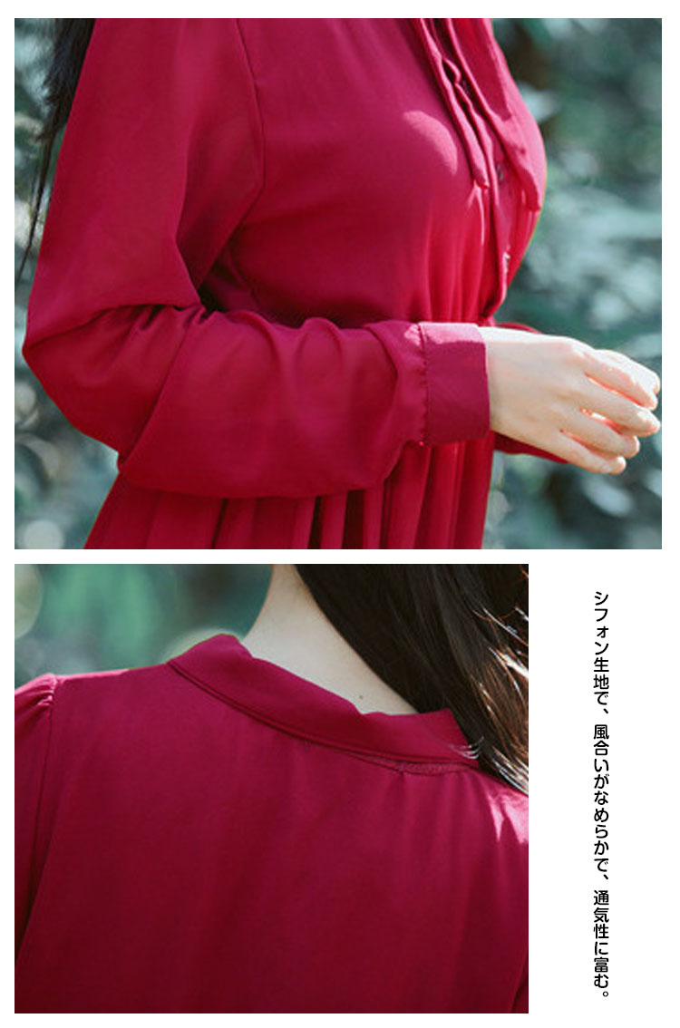 | 秋のレディース魅力を際立つワンピース。裾フレアのデザインで、風に向かって生き生きして揺れ動いて、人に注目される。特別な襟デザインで、簡単に見えるが、上品が落とさず、文芸ガール姿と大人可愛い風格がはっきり現れる。シフォンな生地と長い袖、雨の日には寒くない、晴の日には太陽当たりに心配がない、秋にはぴったり。クラシックのAラインタイプのワンピースで、体つきを問わず、ロング丈で脚長くて着痩せする。 | |
