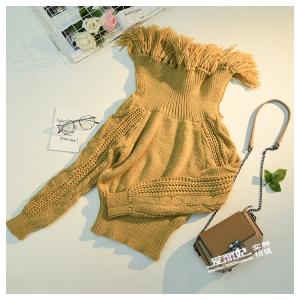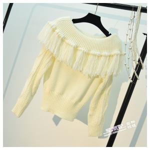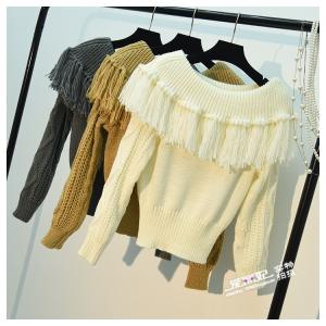 ニットトップス フリンジ オフショル 長袖 ニットプルオーバー 柄編み エスニック ショート丈 セーター 秋冬