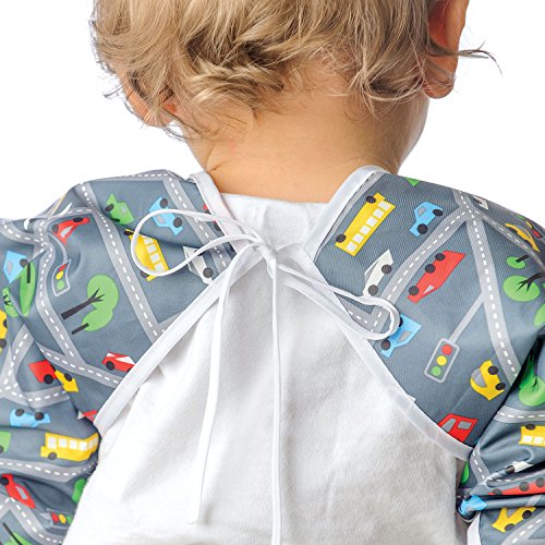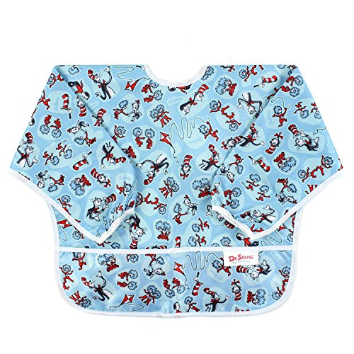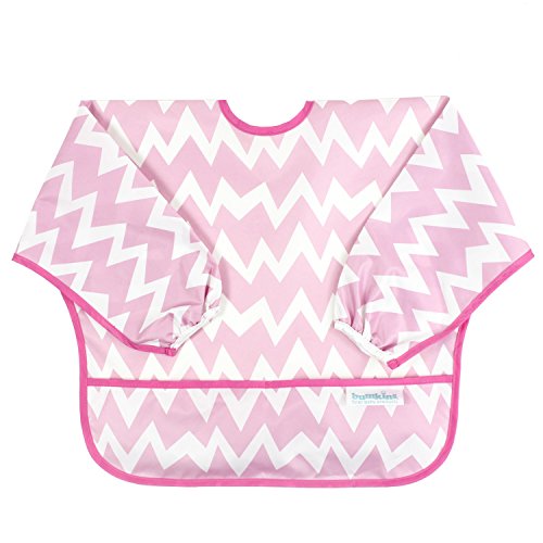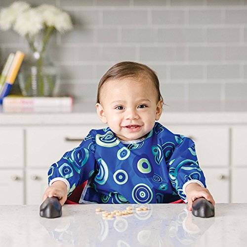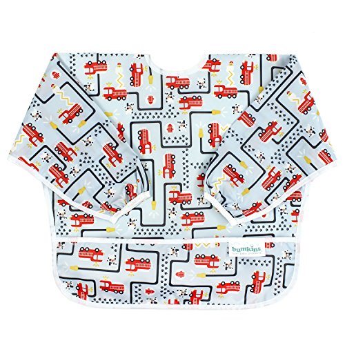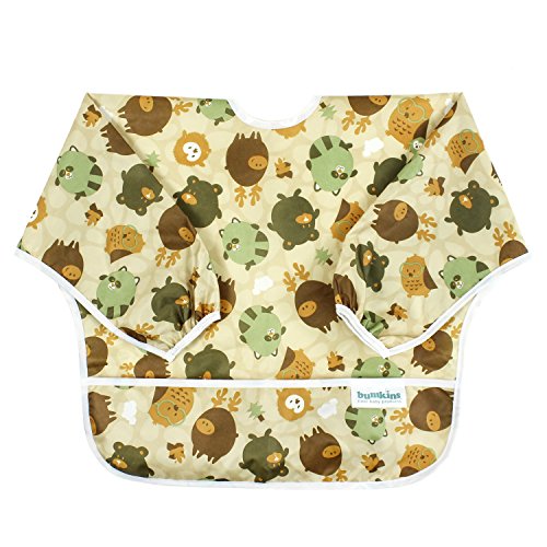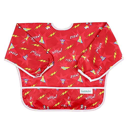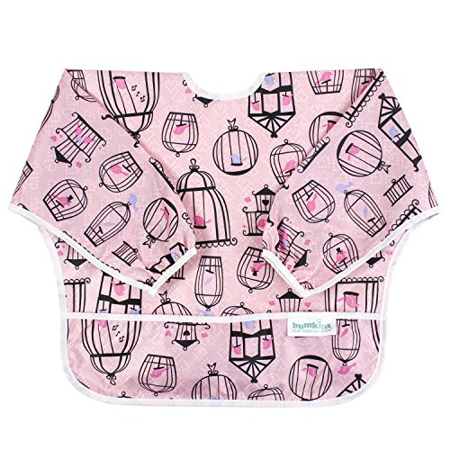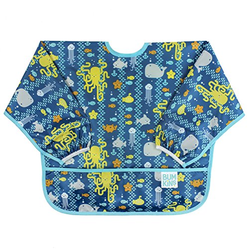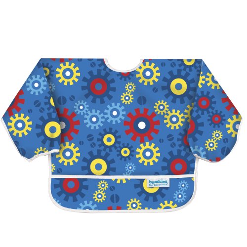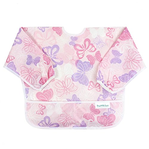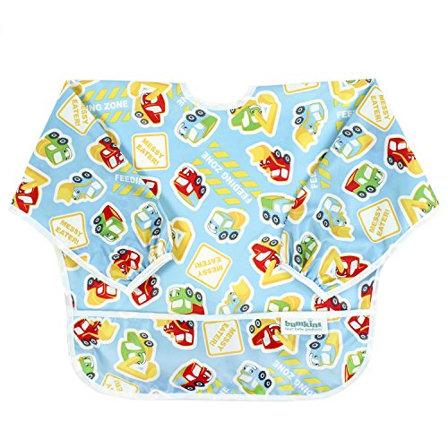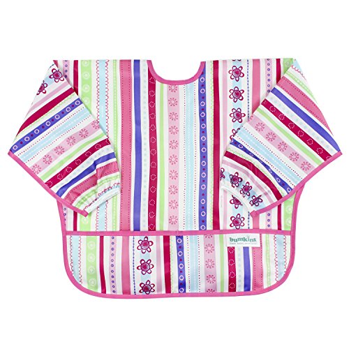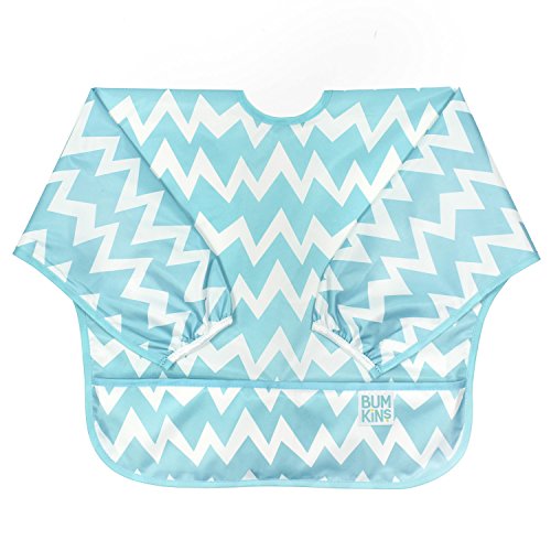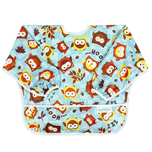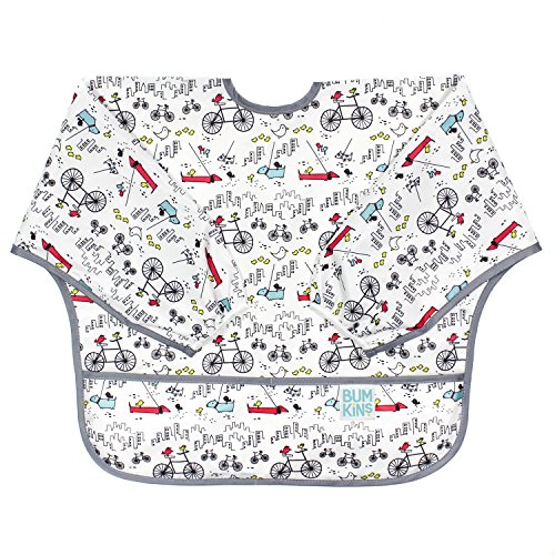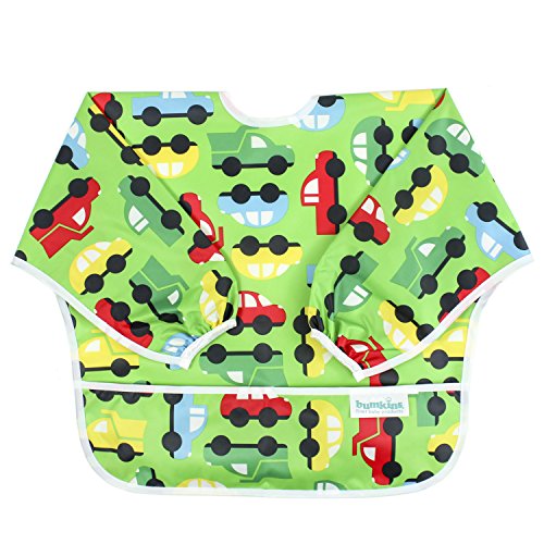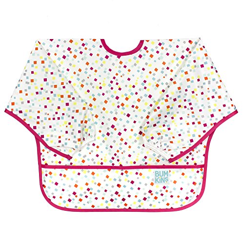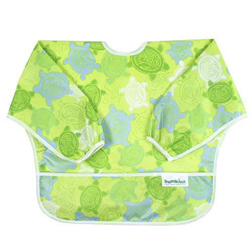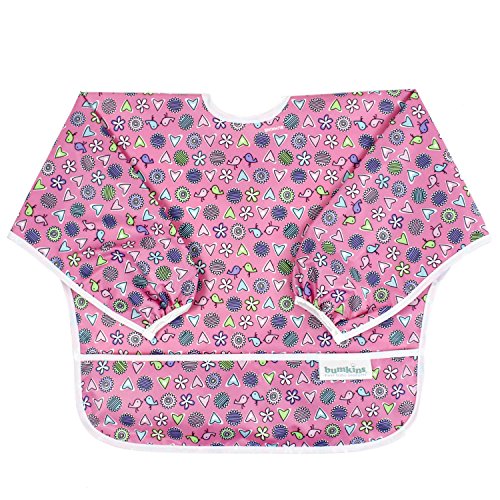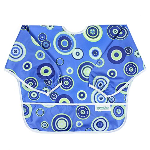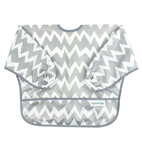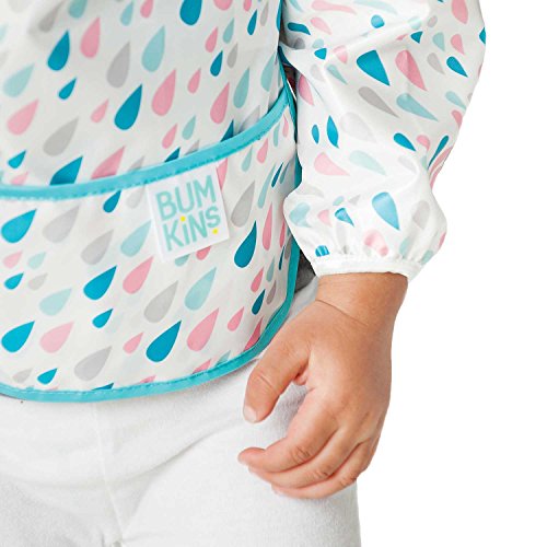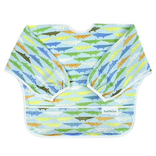 This sleeved bib is comfortable to wear fits like a hospital gown, with shoulder coverage extending 4" in back. Gentle elastic at the wrists keeps food from creeping in. Features: Made of Bumkins' proprietary waterproof fabric Fits easily into diaper baFeature
