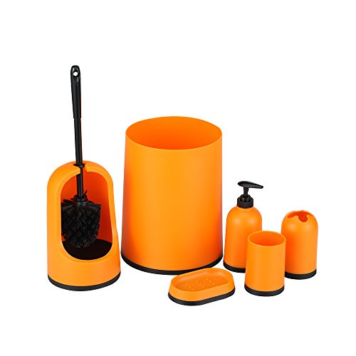Orange Bathroom Set, 6 Pieces Includes Soap Dispenser, Toothbrush Holder, Bathroom Tumbler, Soap Dish, Toilet Brush, Plastic Trash Can