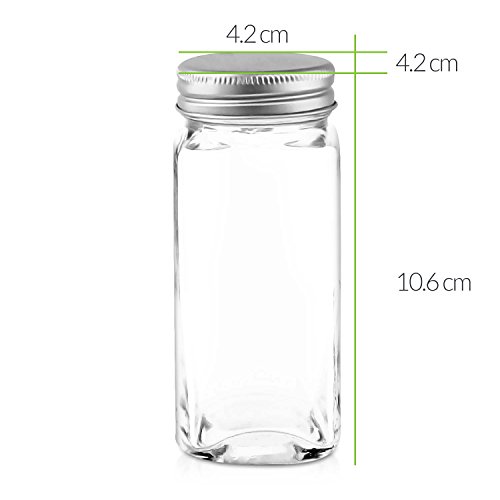 PREMIUM QUALITY GLASS AND AIRTIGHT SEAL LID FOR EVERYDAY FRESHNESS - Each glass is made with BPA free glass and food grade stainless steel. They come with airtight seals and lids ensuring an everyday freshness of spices and herbs. Each jar measures: 4" x 1 3/4" with a 1 1/4" opening.