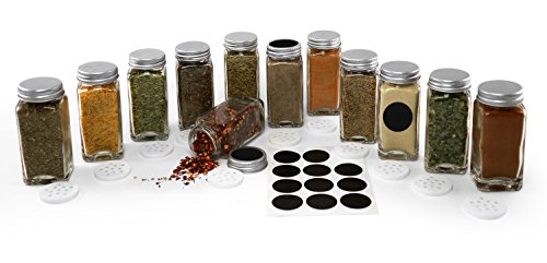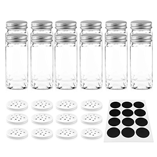 Nellam 12 Square Spice Jars Set with Shaker Tops and Sticker Labels 4oz Clear Glass Containers with Silver Top Kitchen Organizer Bottles for Pepper Salt Herbs and Spices