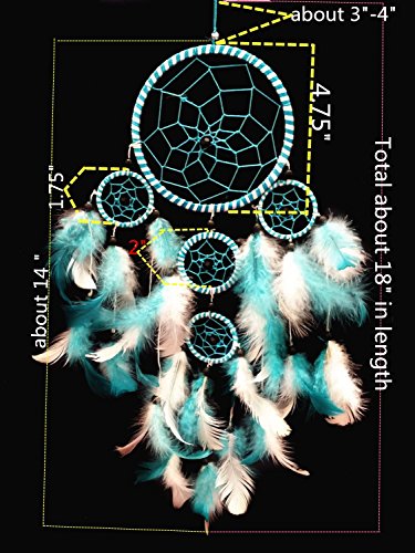 Size ( please see the additional picture): around 14" from the top of the big ring to the bottom feathers; the hanging string is about 4" ; Total about 18" in length.