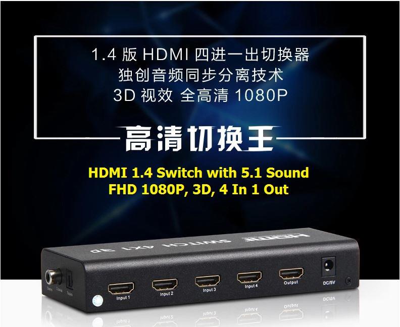4 In 1 Out HDMI Switch Selector Switcher with 5.1 Audio Sound output