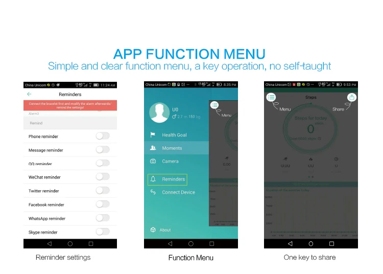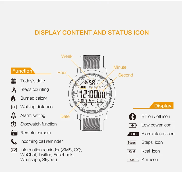 Function:Calendar,Week,Remote Control,Noctilucent,Alarm Clock,Push Message,Passometer,Message Reminder,24 hour instruction,Call Reminder,Fitness Tracker