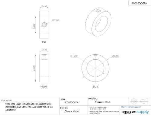 Climax Metal C-125-S Shaft Collar, One Piece, Set Screw Style, Stainless Steel, 1-1/4" Bore, 2" OD, 11/16" Width, With 3/8-16 x 3/8 Set Screw