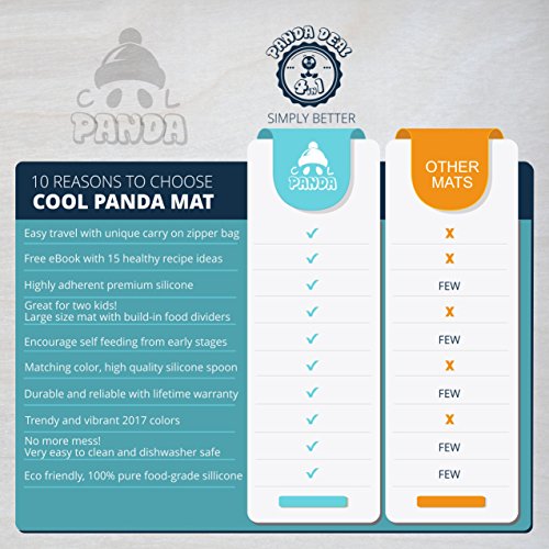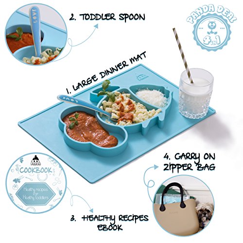 - LIMITED OFFER 4 IN 1 PANDA DEAL AVAILABLE NOW! Get Our Complete Package Launch Offer with Accesories for Easy Eating: Extra Large Cool Panda Eating Mat (Dimensions: 15 x 10 x 1 inch) + Carry On Zipper Bag with Handles which Makes it a Great Option for Traveling + Matching Color Rubber Spoon + eBook with 15 Healthy Recipes Ideas for Baby Boys and Girls. This Baby Food Plate could Be the Best Baby Shower Gift you can choose!