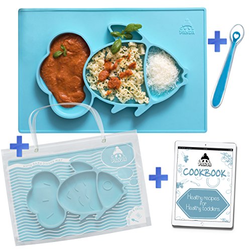 Cool Panda Fun Silicone Feeding Placemat for Babies, Portable & Reusable Travel Bag, Spoon and Healthy Recipes Ebook Included, Non-Slip Suction Plate, Large Size Set: 15"x10"x1", Blue