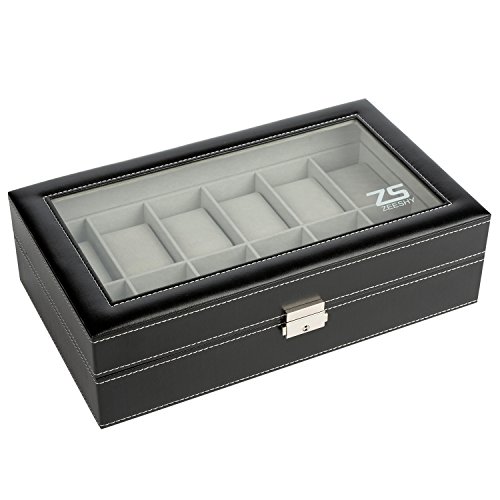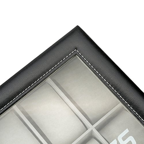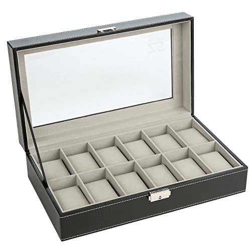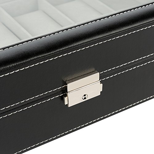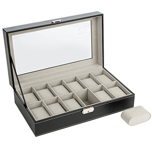 Zeeshy 12- slot Watch Box Black Pu Leather Diaplay Case Organizer Glass Top with Key Lock