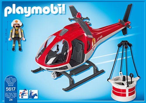 -. Binding : Toy -. Brand : PLAYMOBIL® -. EAN : 4008789056177 -. Feature : Extinguish fires from the sky with the Forest Fire Helicopter / Kids can fill the water bucket before attaching it to the copter and flying to the scene of the fire / Pull the lever to empty the bucket, spraying water over the ground and putting out the fire / This bright red helicopter is outfitted with functioning top and tail rotors / Includes one figure, helicopter, water bucket, and other accessories -. IsAdultProduct : 0 -. ItemPartNumber : 5617 -. Label : Playmobil -. Manufacturer : Playmobil -. Model : 5617 -. MPN : 5617 -. PackageQuantity : 1 -. PartNumber : 5617 -. ProductGroup : Toy -. ProductTypeName : TOYS_AND_GAMES -. Publisher : Playmobil -. Studio : Playmobil -. Title : PLAYMOBIL Forest Fire Helicopter -. Warranty : 30 day warranty against manufacturer defects