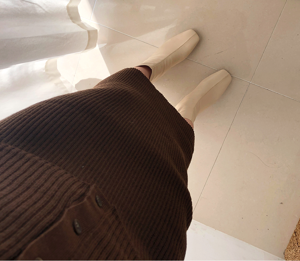 스커트는 롱 기장의 H라인 핏으로 너무 깊지 않는
