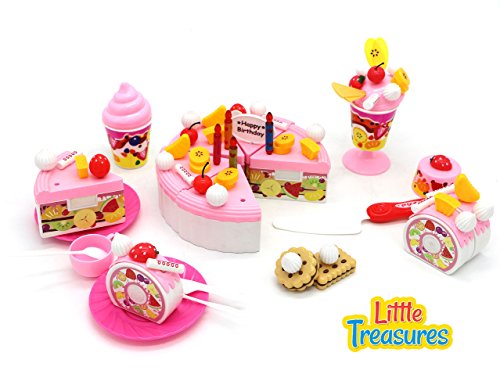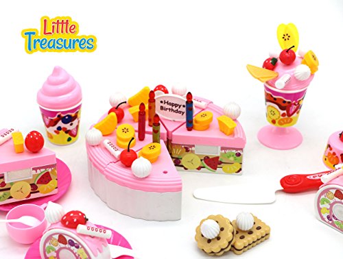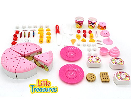 -. Feature : ALL THE INGREDIENTS FOR A PERFECT PARTY: This toy party set is made for young girls who enjoy role playing games / It includes a fruit cake, Swiss roll, topping materials like cream and fruits, candles and other items to decorate with, biscuits and ice-cream / This set also includes plates, spoons, knife, cups and ice-cream bowls for playtime partying / COLORED TO EXCITE: All the included items are primarily colored in shades of red, pink and yellow to give a wonderful appearance. The vibrant toy set excites preschoolers and provides a chance for playing with friends. The cakes can be cut into pieces and the variation in toppings for cakes, ice-cream and biscuits also gives a life-like effect. / SATISFACTION GUARANTEED: The Toy play set is packed in a detailed, colorful box with instructions included! 100% satisfaction guaranteed - if you are not happy with the toy for any reason, you can get a hassle free refund.