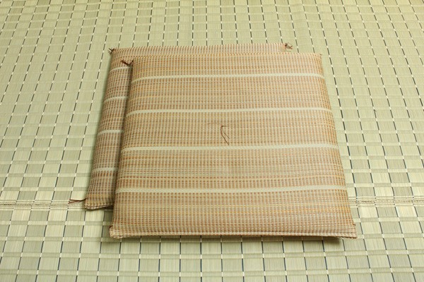 ふっくら柔らかい肌感触のイ草座布団です。メセキ織という技法で柔らかい肌感触に仕上げました。またイ草の生地を縫製した後に、生地を湿らせ、裏返しにする『返し』という技法で仕上げております。イ草を通常曲げてはいけない方向に曲げますので、良い(太く強い)イ草でなければ作ることができません。返すことにより、ふっくらしたボリューム感を出しました。国産(九州産)のい草を使用しています。一本一本が太く、表皮が厚く繊維がキメ細かいので弾力性があり、耐久性に優れています。い草には空気の自然浄化作用、湿度の調節作用などがあります。また汚れにくく、使用するうちに黄金色に変化し味が出ます。い草に青森ヒバ加工を施しています(抗菌、防臭効果)。中材はウレタンをフェルトでサンドした三層構造で、適度なクッション性があります。