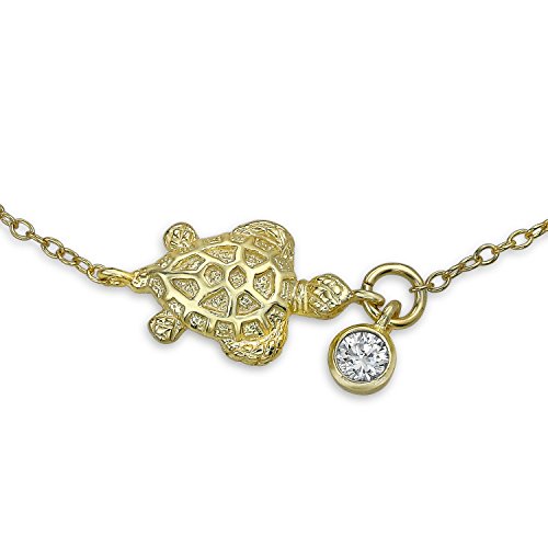 A few of the many symbols turtles represent are protection, endurance, longevity, and strength. Display your similar qualities of this animal with our sea turtle charm ankle bracelet. Finely crafted by Gold Plated over .925 sterling silver, this endearing sea life jewelry glitters with one round bezel set cubic zirconia stone dangling beside it. This classy yet affordable Gold Plated anklet has a lobster claw clasp allowing for easy adjustment. There is a one inch extender letting you chose between 9 or 10 inches which makes it convenient for women of all sizes to wear. Perfect for the summer, this simple turtle charm jewelry makes a great gift for a friend or a special someone. Order this turtle gold anklet with other animal themed jewelry to kick off your summer style.Feature