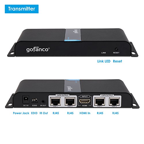 gofanco 1080p 1x4 4 port HDMI Extender Splitter over CAT5e/CAT6/CAT7 ethernet cable with IR remote control (1 in 4 out) –Up to 40m (130ft) at 1080p 60Hz