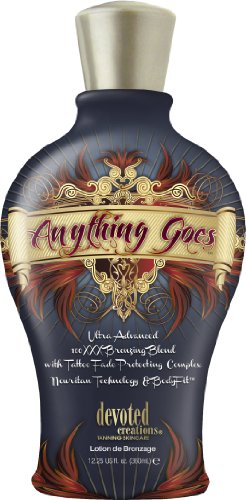 Get dark fast! Protect your tattoos! Firm and tighten your skin... Hey, Anything Goes! This extreme instant and delayed bronzer blends with advanced skin care technologies and a revolutionary tattoo fade protecting complex to deliver the most amazing results all around! * BodyFit - Reduces the appearance of cellulite and promotes firmness. * RevitaFit - Tones and tightens the skin. * Subliskin - Anti-aging and skin tightening moisture barrier. * Nouritan - Stimulates tyrosine activity and promotes an even and long lasting tan. *FreshTek - a proprietary blend of skin deodorizing and freshening ingredients.