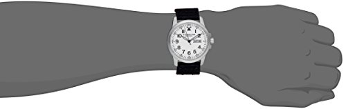 - Feature : Brushed finish stainless steel round shaped case with black canvas covered genuine leather strap / White dial and black printed Arabic numerals with day and date window at three o'clock position / Quartz movement / Case diameter: 42mm / Water resistant to 165 feet