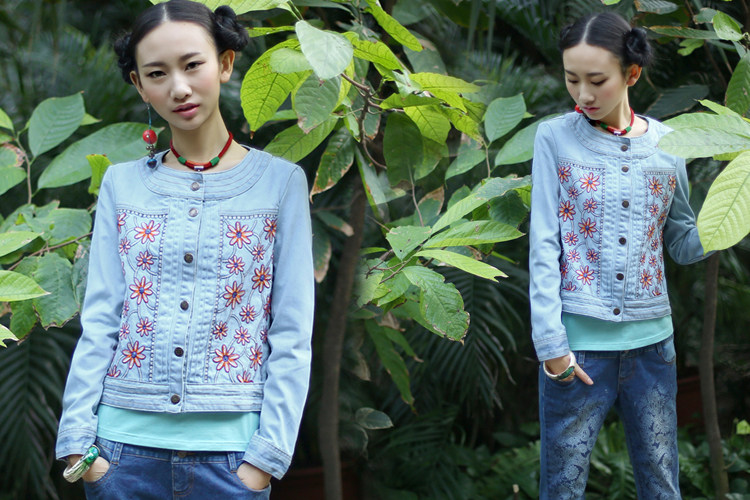| 前身的绣花绣面平服、针法丰富、线迹精细、色彩鲜明,以线代笔,通过多种彩色绣线的重叠、并置、交错产生华而不俗的色彩效果。尤其以套针针法来表现图案色彩的细微变化最有特色,色彩深浅融汇,具有国画的渲染效果。 | 这款牛仔外套所选用的牛仔布,全身水洗磨白做旧,流露出浓浓的复古文艺气质,质地舒适,挺括有型。裂帛的牛仔布是由棉织成的,水洗之后的牛仔变得柔软、贴肤,对牛仔布进行过一次预缩水和定型处理。一般全棉牛仔布在制衣后还会有2%左右的缩率。1.好的牛仔衣物尽量不要经常洗,经常洗容易变形掉色。少洗常穿几月或者大半年后,会和你的体型保持一样。2.注意千万不要用烘干机烘你喜爱的牛仔衣物,烘干会让它缩水。3.在洗牛仔衣物时,要把口袋掏出来洗,这样让它保持原有的洗旧颜色。 |