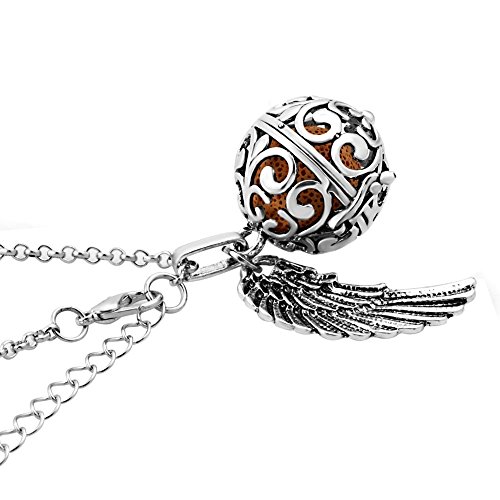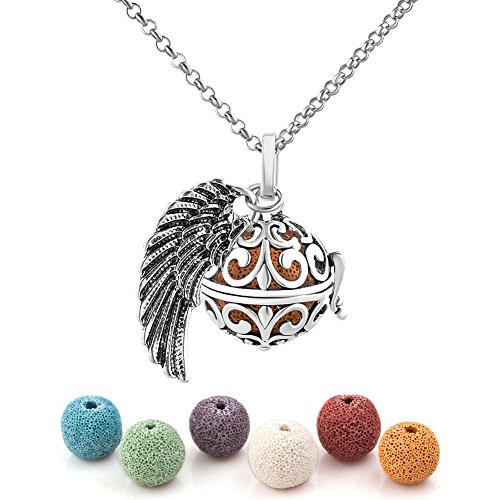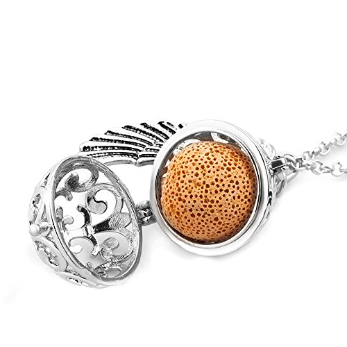 Third Time Charm Natural Lava Rock Stone Aromatherapy Angel Wing Necklace For Essential Oil Diffuser Locket Pendant With 6 Lava Beads (Silver Plated)