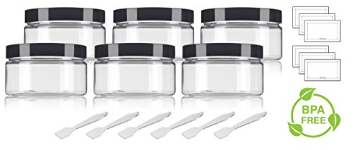 Clear PET Plastic (BPA Free) Refillable Low Profile Jar - 4 oz (6 pack) + Spatulas and Labels