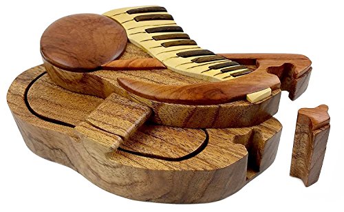 Music Note and Keyboard All Natural Exotic Woods Puzzle Box, 6.5" X 3" X 2.75" with Sliding Wooden Key Lock, Sliding Cover and Inner Lid to Hidden Compartment. Hand-made Wood Onlay Design on Lid.