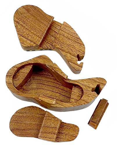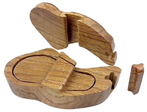 Beautifully hand-crafted puzzle box with carved and inlaid woods applique decor on lid. Remove wooden slider key, slide off cover then remove inner lid to reveal hidden compartment.