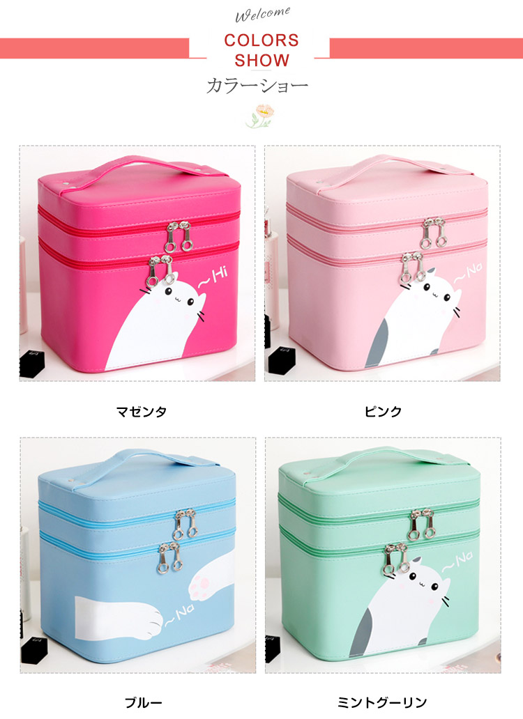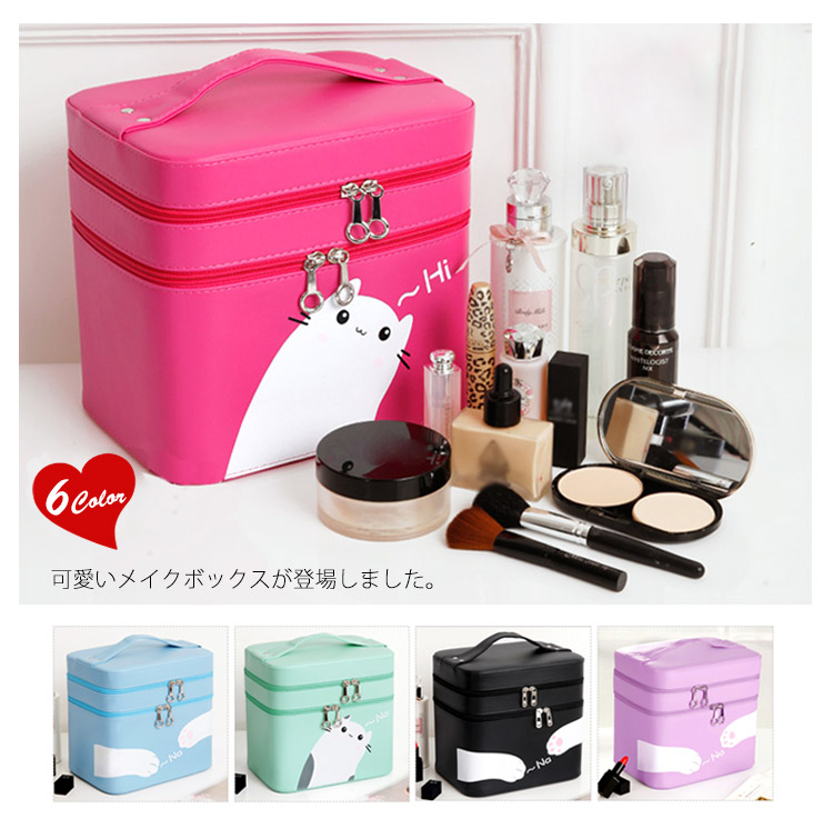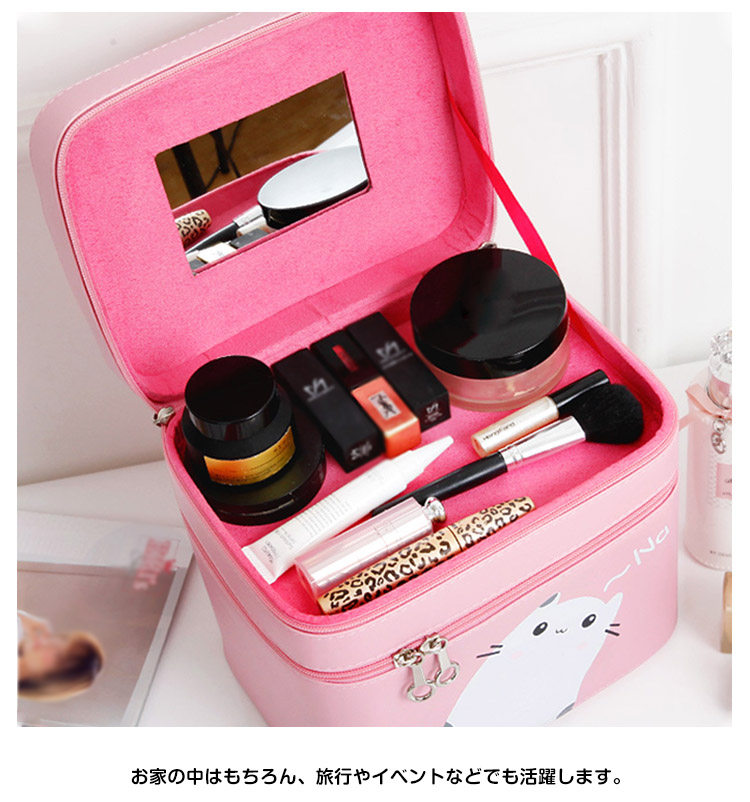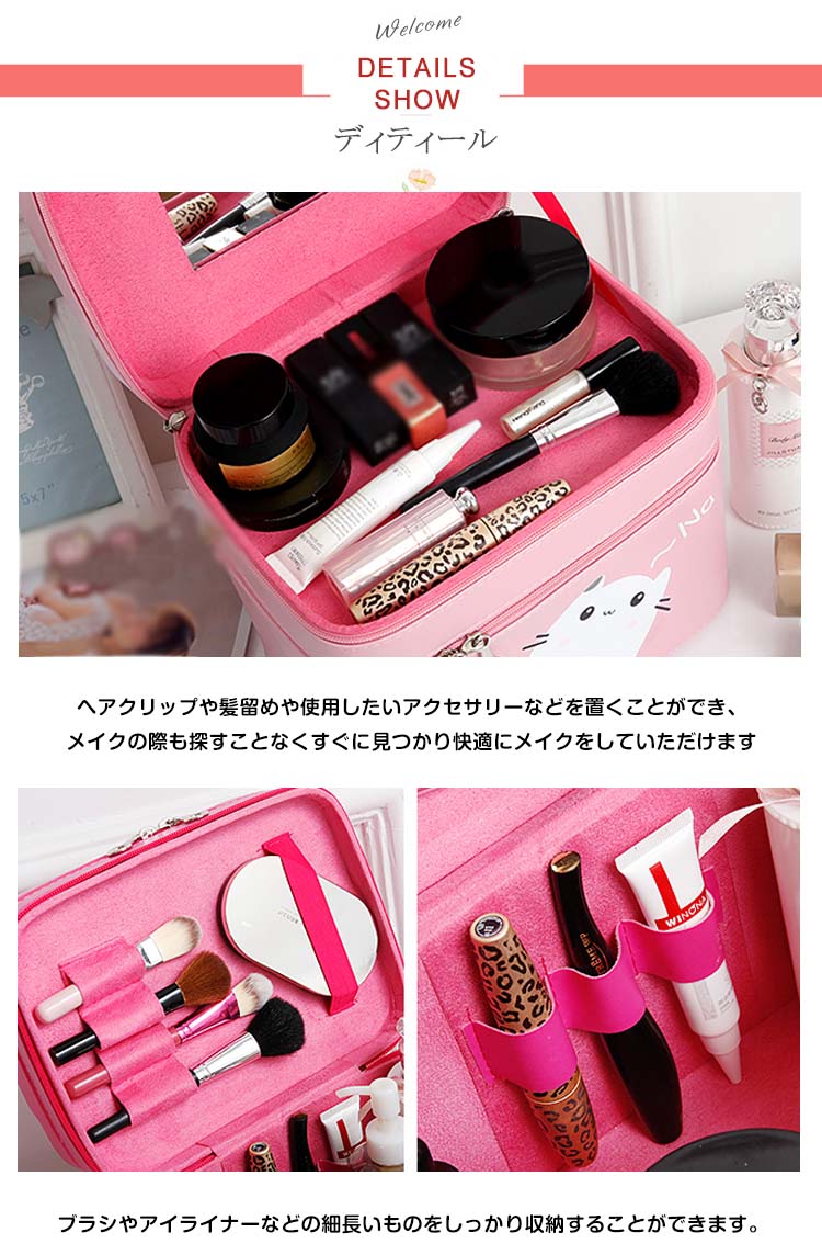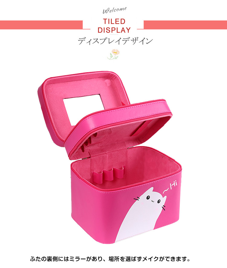 | 可愛いメイクボックスが登場しました。ボックス表面は遊び心のあるネコデザインです。ハンドルがついているので持ち運びも便利。ふたの裏側にはミラーがあり、場所を選ばずメイクができます。お家の中はもちろん、旅行やイベントなどでも活躍します。 | |