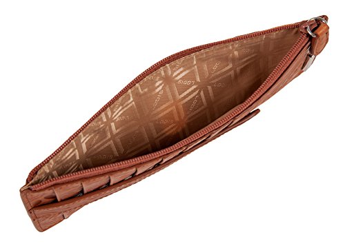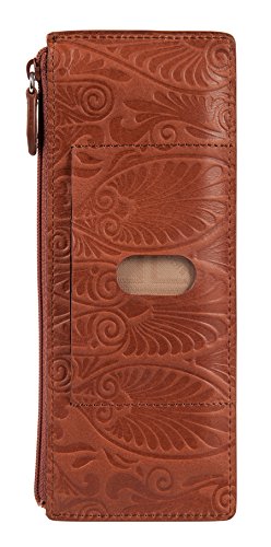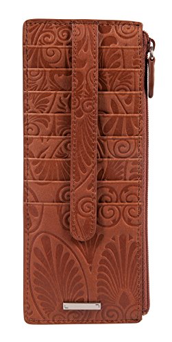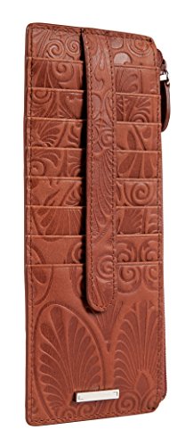 Denia offers festival ready accessories for the woman-on-the-go. With an embossed deco paisley emboss on smooth, rich Italian leather; its a luxe update to a bohemian feel. Organize all your credit cards, gift cards, store cards, and even travel cards in this classic LODIS card case. It features an exterior ID pocket, a zip pocket perfect for currency or valuables, and 8 exterior card slots with snap closure for added security.Feature