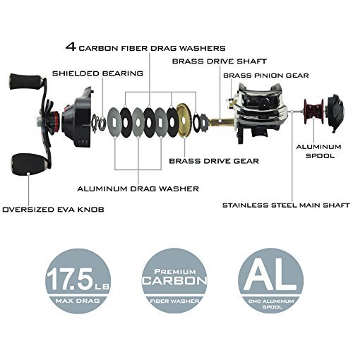 UNMATCHED – Precision cut brass gear structure and carbon fiber drag system delivering 17.5 LBs of drag offer the ultimate in a high performance low maintenance baitcasting reel package.