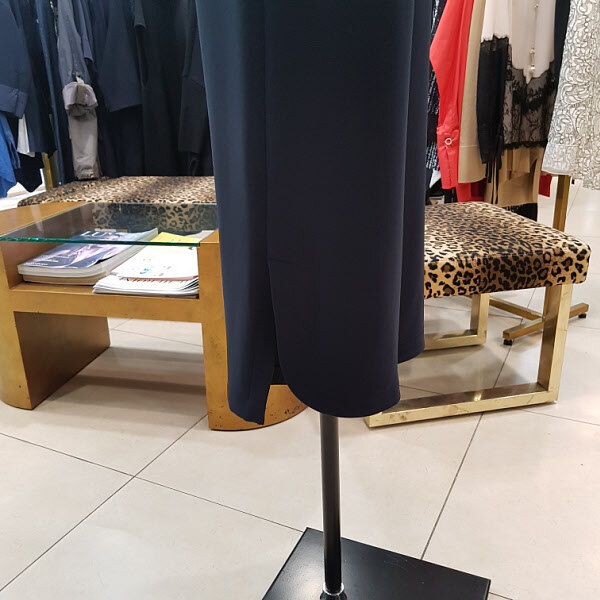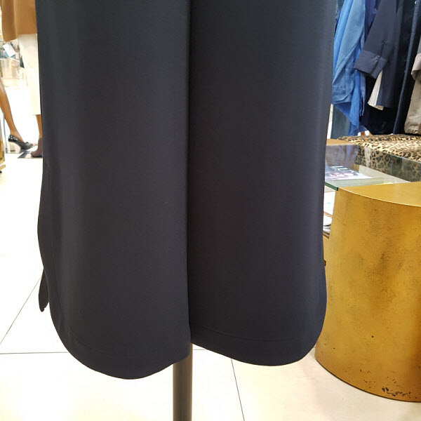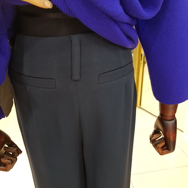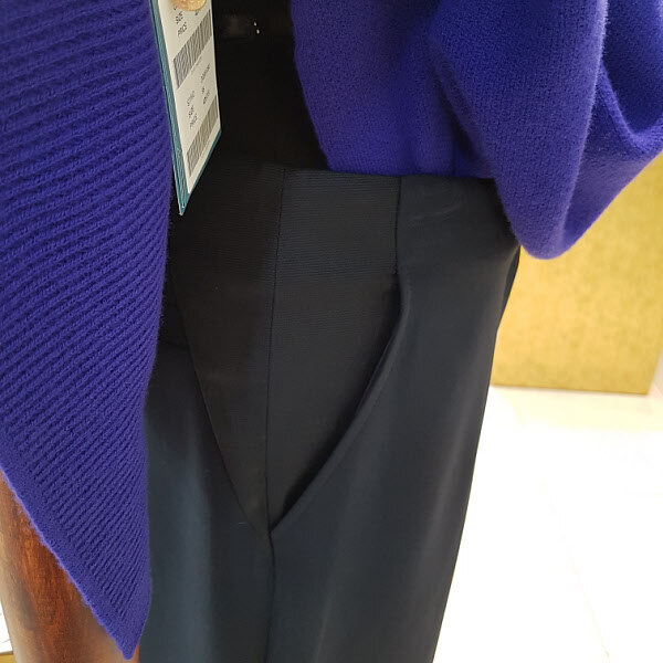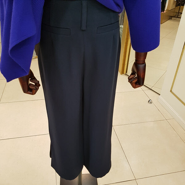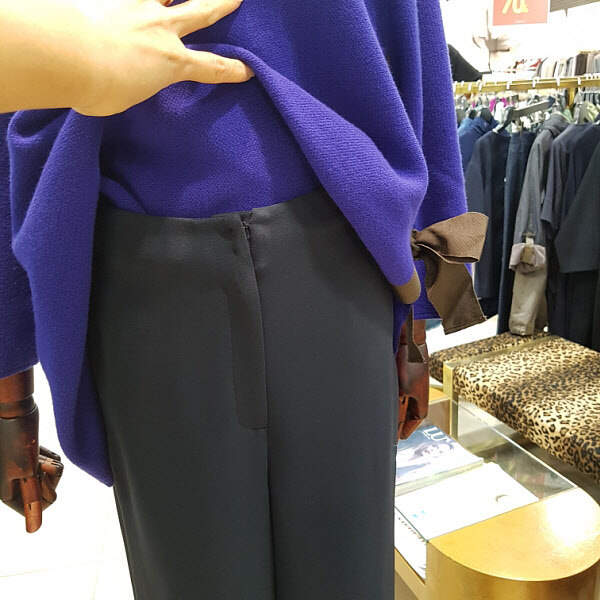 밑단의 트임과 앞뒤가 언발한 라인이 포인트인 팬츠 디자인입니다.옆선 포켓에 소재배색이 들어가 있어서 세련된 분위기가 연출됩니다.