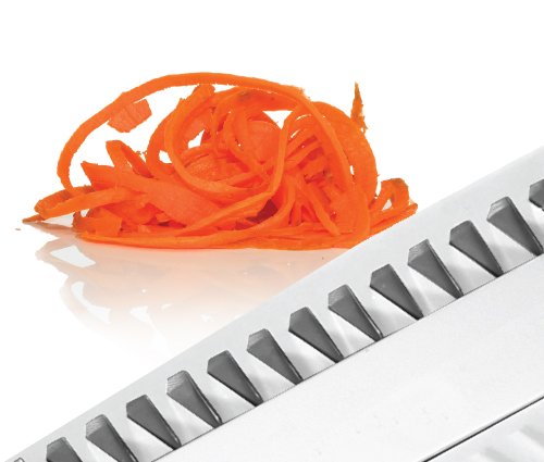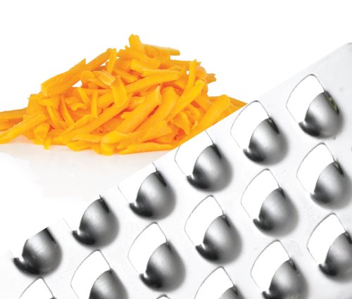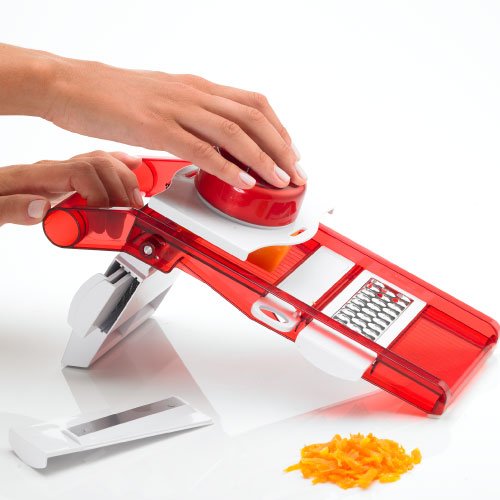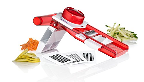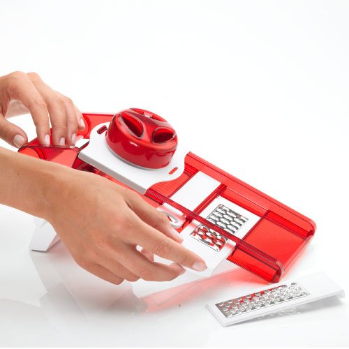 - Feature : Mandoline with 5 interchangeable blades - zest, grate, fine grate, slice, and julienne / Can be used upright or leg folds up for hand-held use / Blades conveniently store in mandoline handle / Food holder provides comfortable non-slip protection / Constructed of high quality plastic and stainless steel; Red