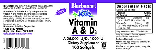 Vitamin A 25,000 IU and D3 1,000 IU soft gels provide 100% natural vitamin A and vitamin D3 from deep sea, cold water, fish liver oil and is molecularly distilled. Vitamin A is require for the proper development and functioning or our eyes, skin, immune system, and many other parts of our bodies. Vitamin D is required for the regulation of the minerals calcium and phosphorus found in the body. It also plays an important role in maintaining proper bone structure.Feature