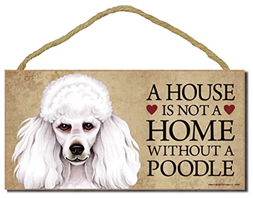 Poodle (white) "A house is not a home without a Poodle" - 5" x 10" Door Sign with Bonus 1pc Stand and "I Love My Dog" 3 Inch Round Decal