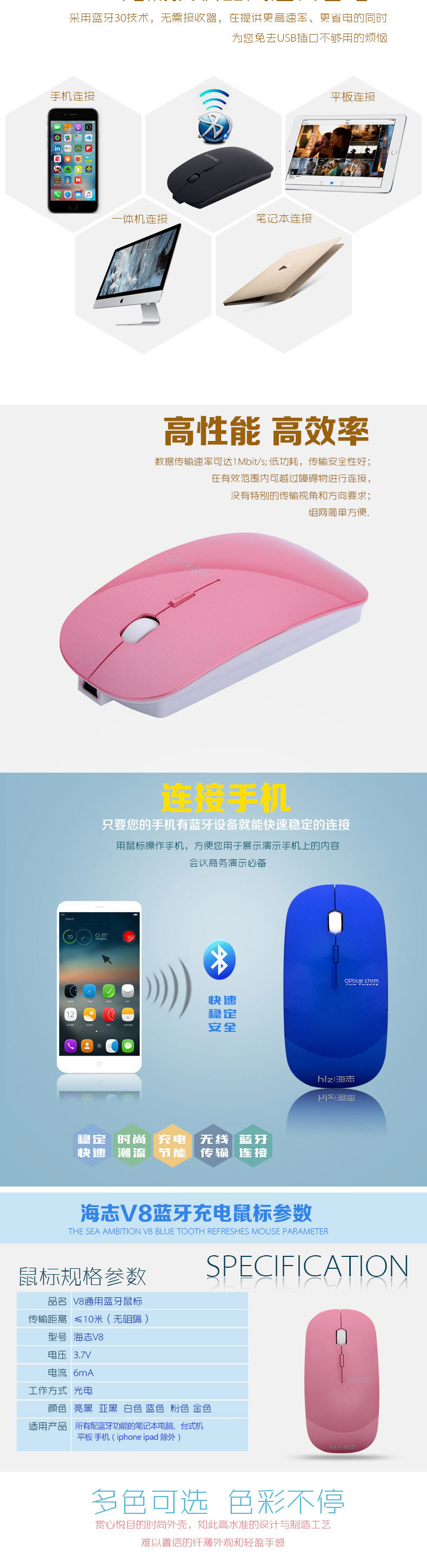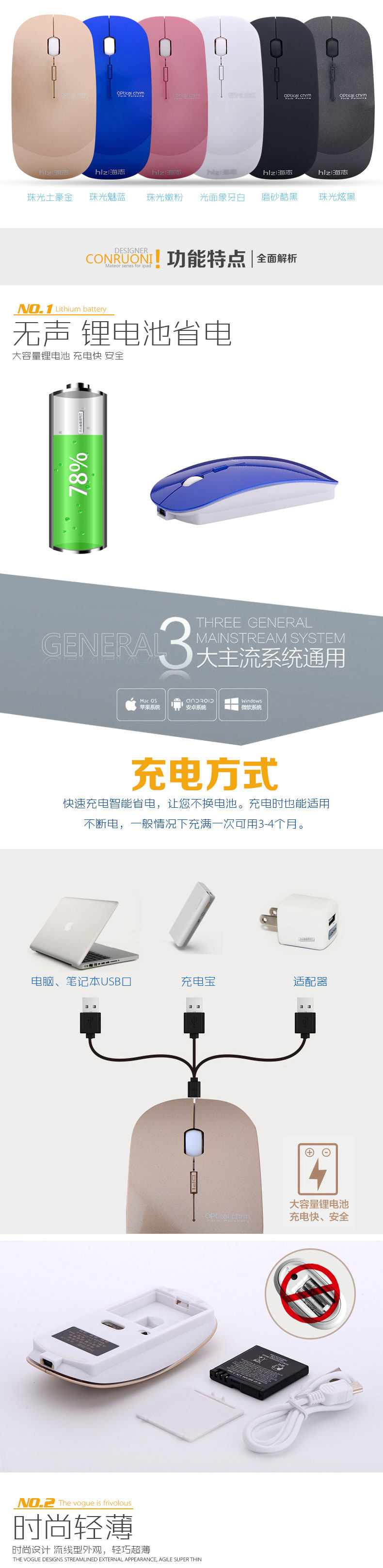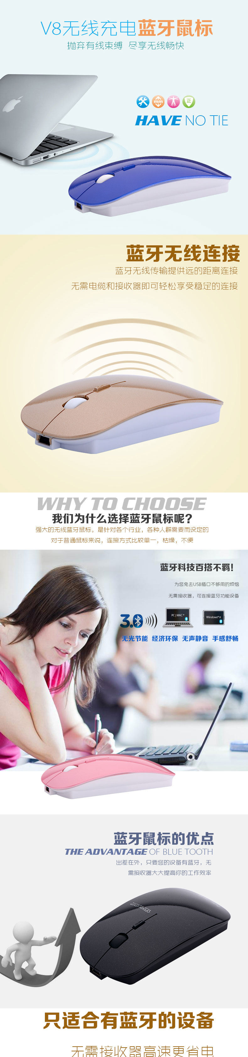 海志V8蓝牙鼠标无线无声静音鼠标 可自带充电鼠标女生鼠标