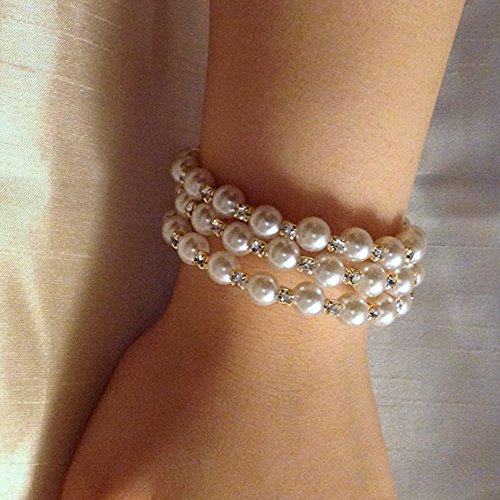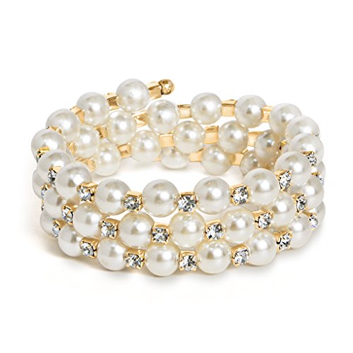 -. Feature : 3 Rows of simulated pearl / Wraparound coil style with sparkling clear crystal / Stretch elastic style to ensure perfect fit for any wrist / Made of base metal alloy with goldtone links / Ideal for weddings, parties, birthday gift, prom, pageant, and evening wear