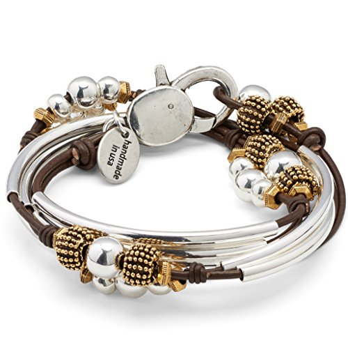 -. Title : Paris Silver Plated Crescents with Gold and Silver Beads 2 Strand Metallic Chocolate Leather Wrap Bracelet