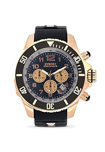 CHRONO ROSE BLACK: The demand for KYBOE! watches quickly landed them in high end department stores and selected fine jewelers across the nation. With their unique design, size and color combos, the word quickly spread among ÒAÓ list celebrities, athletes, music Industry professionals and watch collectors. The Chrono Rose Black showcases the true elegance of rose gold. This watch contrasts its rose gold case beautifully with a black dial, bezel and color-matched band.Feature
