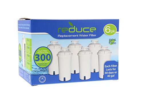 Studio : reduce Publisher : reduce Binding : Kitchen Product Description reduce Replacement Water Filter is the best choice in making the purest drinking water for a healthier body and better living. The Filter uses advanced technology which joins micro netting, coconut-based activated carbon and ion exchange resin to reduce metals and other contaminants like copper, chlorine, cadmium, mercury, zinc, aluminum while reducing chrome taste and odor. The filter is compatible with the newest model Brita pitcher and other national brand pitchers and dispensers. The filters are made of BPA free materials and are certified by Water Quality Association, a global, non-profit water treatment industry association. It is fast and easy to replace, simply soak the filter for ten minutes then insert the filter into the reservoir. Reduce filtration system provides an alternative to national brands through safety innovation and value and allows for many uses such as filling reusable bottles, filtering water for coffee, filtering water for cooking, and filtering your pet's drinking water. Each filter lasts for 60 days or 40 gallons. 0