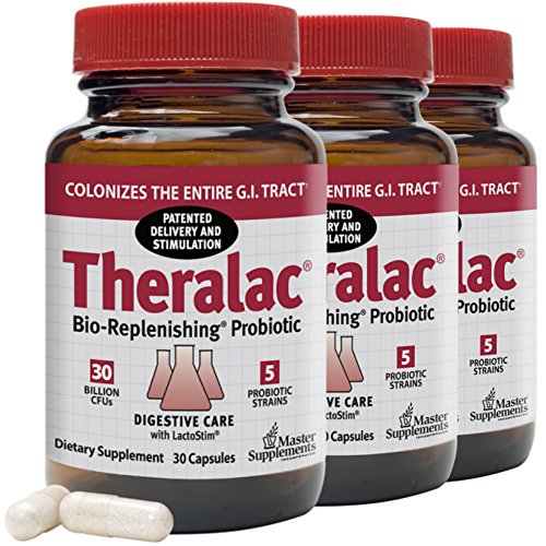 3 bottles of 30-count (total 90 counts) of probiotics dietary supplement. Theralac probiotic diatery supplement contains 30 billion CFU of lactobacilli and bifidobacteria probiotic cultures for complete intestinal coverage. The strains synergize and work together to promote digestive health, wellness, and a return to regularity so you can feel your best. Probiotics promote digestive health for men and women. Deep Delivery: Theralac's unique delivery system utilizes sodium alginate to protect Theralac as it travels through the stomach, enabling the probiotic bacteria to pass through unharmed, providing deep, targeted delivery to the gut. Third party labs guarantee the potency, purity, and quality of every Theralac probiotics to ensure potency through expiration.Feature