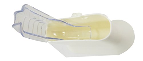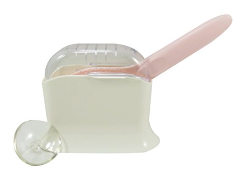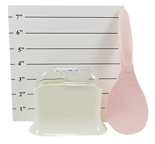 THE SPECIFICS: Bundle of 2 items: 1 rice scoop holder in white (made of resin and plastic - 5” x 4”) and 1 nonstick plastic paddle spoon with a cute flower design (7 3/4” x 2 3/4”) available in pink. This set includes a suction cup.