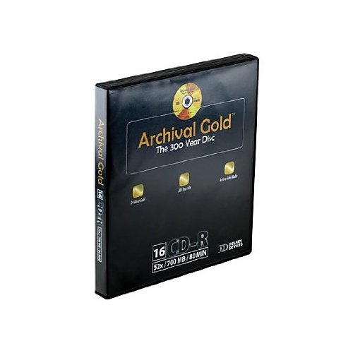 Studio : Delkin Publisher : Delkin Binding : Electronics Product Description The innovative materials found in eFilm Archival Gold CD-R s make them one of the most reliable storage mediums available. Typically CD-R s are known to deteriorate quickly due to Earth s common elements such as: ultra violet light, heat, and humidity. Using an accelerated aging process to test the longevity of CD-R media, eFilm Archival Gold CD-R s have been shown to safely store your images for more than 300 years. The patented Phthalocyanine dye is the most critical component of the CD-R because it is where your data is stored. Your CD burner creates pits in the dye layer when it burns a CD-R and your digital information is stored in these pits. The Phthalocyanine dye reacts quicker to the writing laser than dyes found in most CD-R s on the market, thus making sharper pit edges and making your CD-R easier to read by CD drives. Compared to Cyanine and Azo dyes found in the majority of CD-R s on the market, Phthalocyanine dye lasts significantly longer when subjected to the harmful effects of UV light, heat, and humidity. Gold is one of the most inert elements on earth and Delkin incorporates 20? of 24k gold into every eFilm Archival Gold disc. Gold s inert characteristics prevent oxidation, a common cause of failure to most CD-Rs. Along with the Phthalocyanine dye and gold reflective layer, eFilm Archival Gold CD-R s provide the most extreme protection for your digital images from environmental degradation. Features: Patented Phthalocyanine dye formula that gives a storage life of 300 years Gold is one of the most reflective robust elements on Earth. More than 20 of 24k gold in every CD-R Maximum resistance to the harmful effects of oxidation, a main cause of failure to optical media. Delkin Includes: 16-pack of Gold CD-R media and 3-ring binder (holds up to 40 disks). 0