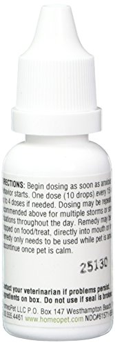 A minimum of 450 drops per container. Promotes calm in pets exhibiting fear from thunderstorms, rain storms, hurricanes, howling winds.