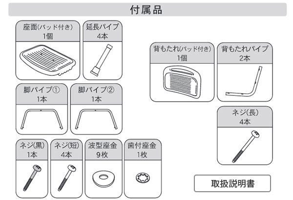 | 素材・材質 | パイプ:アルミニウム合金 座面・背もたれ:ポリエチレン パット:EVA 脚ゴム:合成ゴム |