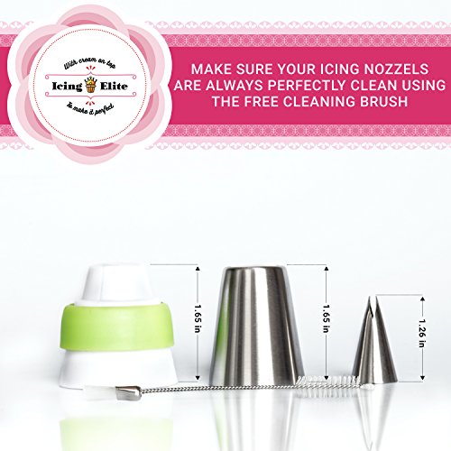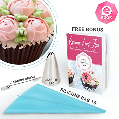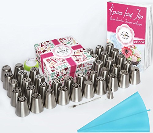 ✅ COMPLETE set of Russian Piping Tips: The Icing Elite Cake Decorating Supplies Set includes 37 Russian Tips + 1 Leaf Tip + 21 Pastry Bag (one Silicon) + Russian Tips Coupler + Cleaning Icing Tip Brush + Icing Techniques and Theme Cake Recipes eBook.