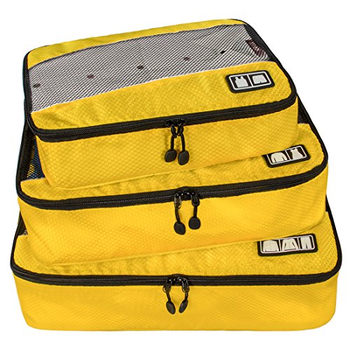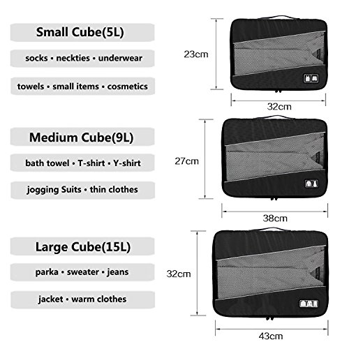 -. Feature : Clothes stay neat and tidy and no longer shift in transit / Top mesh panel for ventilation and easy identification of contents / Great for trips, overnighters, the gym, and much more / Constructed of high-quality, lightweight, water-repellent Polyester with 2 way easy-pull zippers / Dimensions: Small Size: 13L×3H×9W inch; Medium Size: 14.9L×3.9H×10.6W inch; Large Size: 16.9L×4.3H×12.5W inch